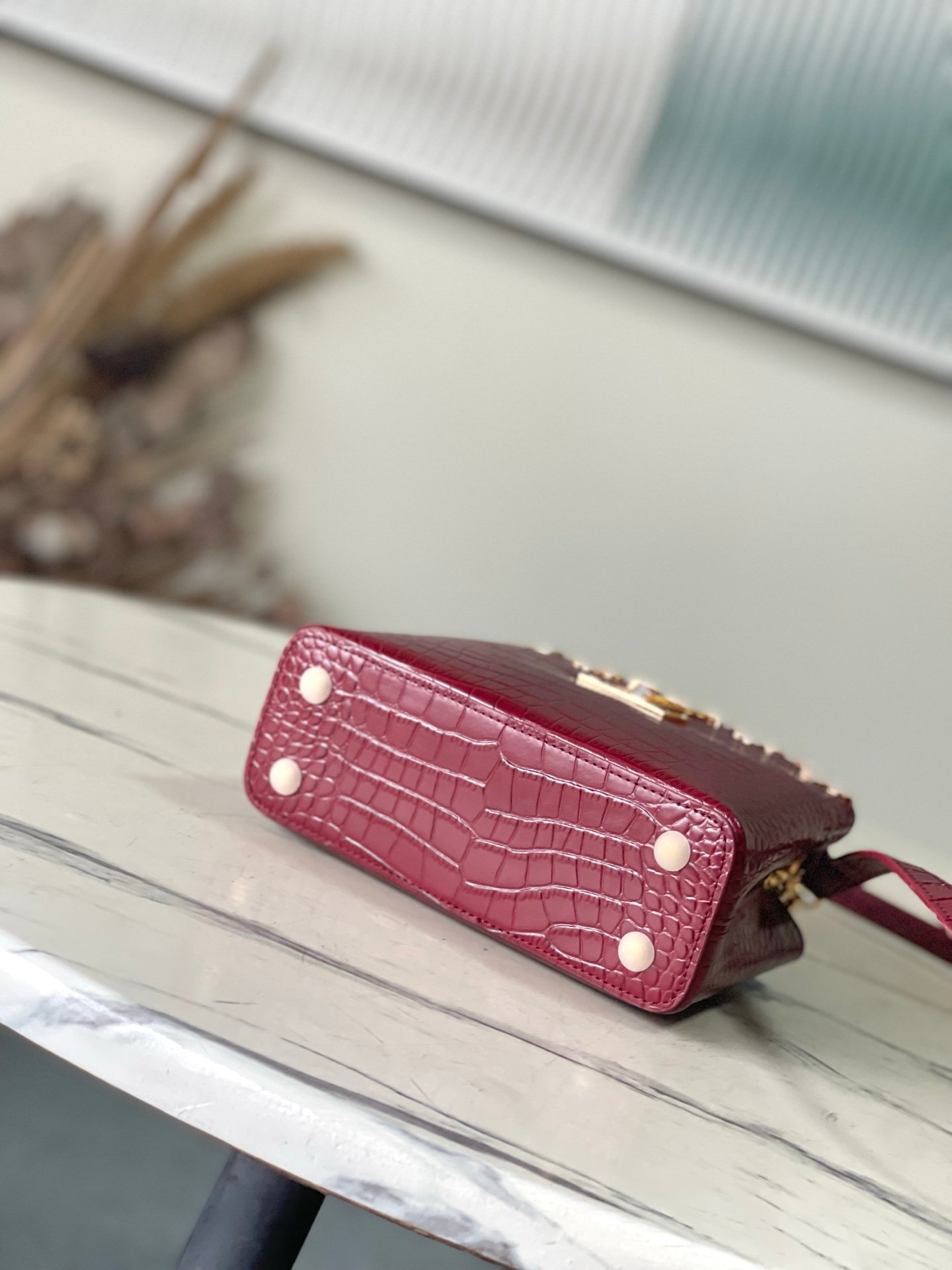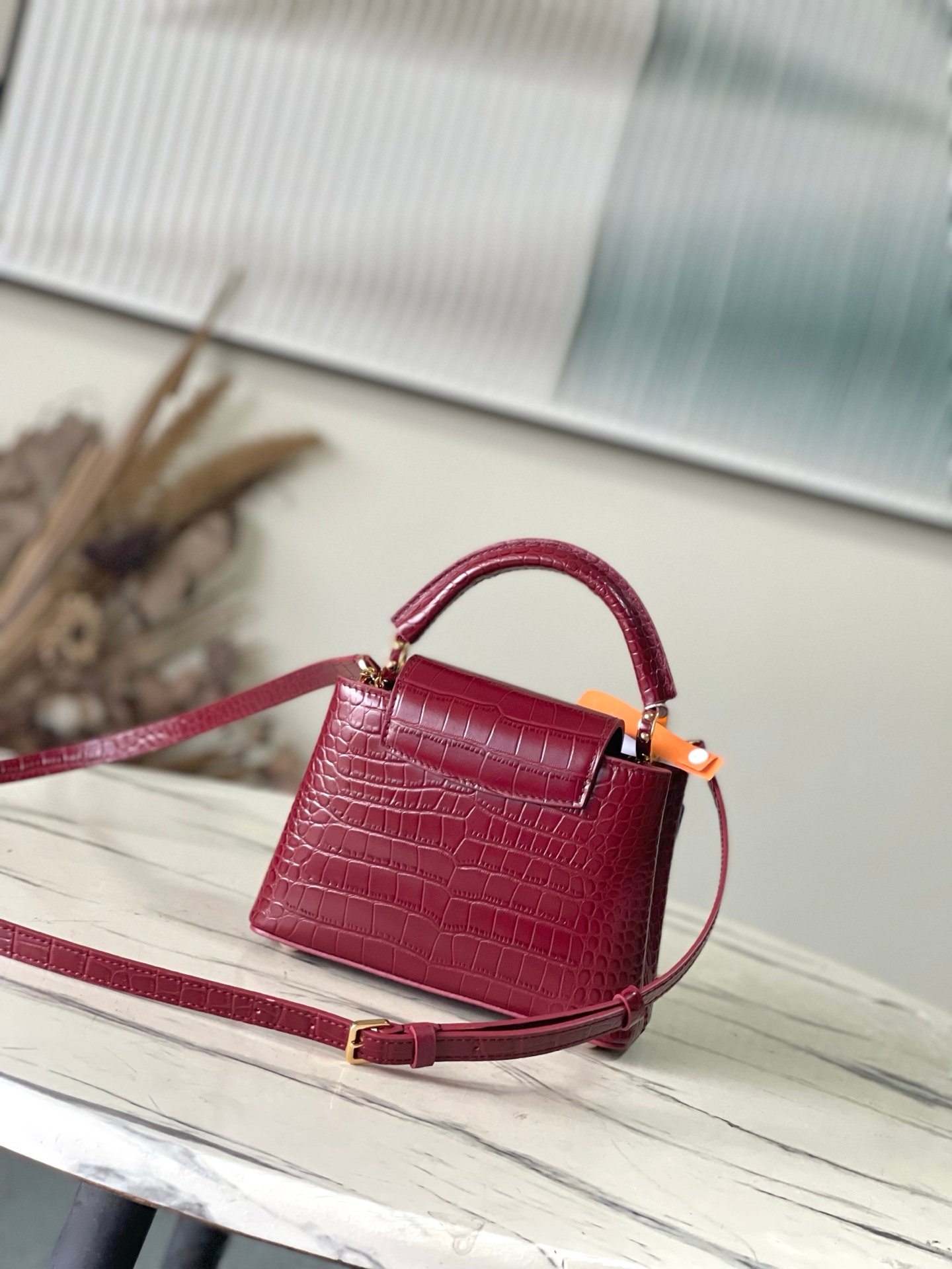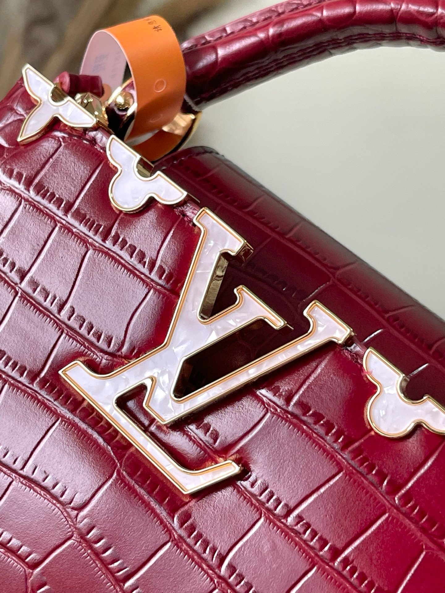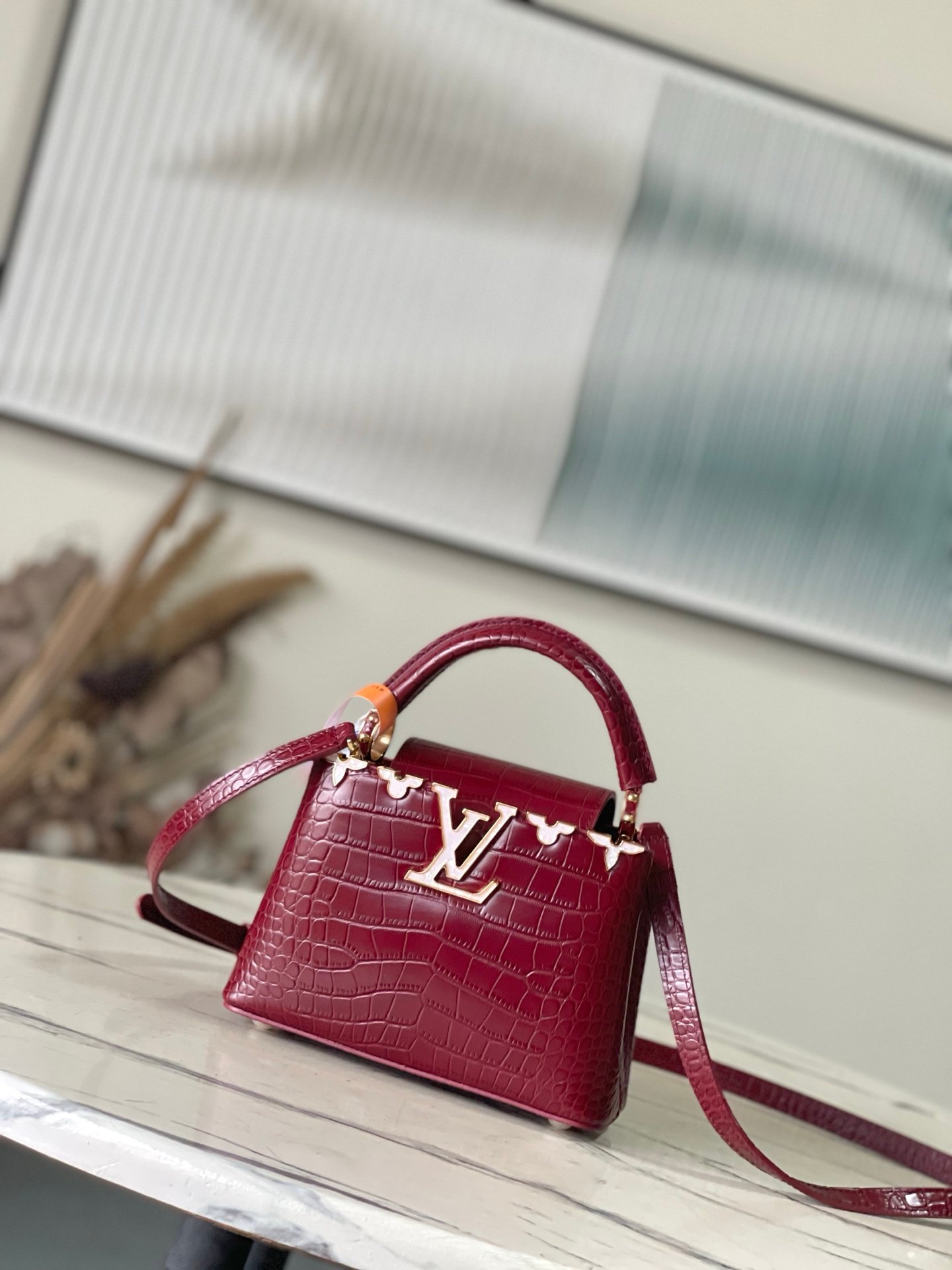 p1250 Premium original leather M86153 burgundy (crocodile pattern – floral white mother-of-pearl) noble crocodile skin pattern, luxurious goatskin lining, shiny metal accessories, unique Capucines cover that can be stored in the bag to display the letter logo, or can be turned out to display the Monogram Flower pattern. Size: 21* 14* 8cm