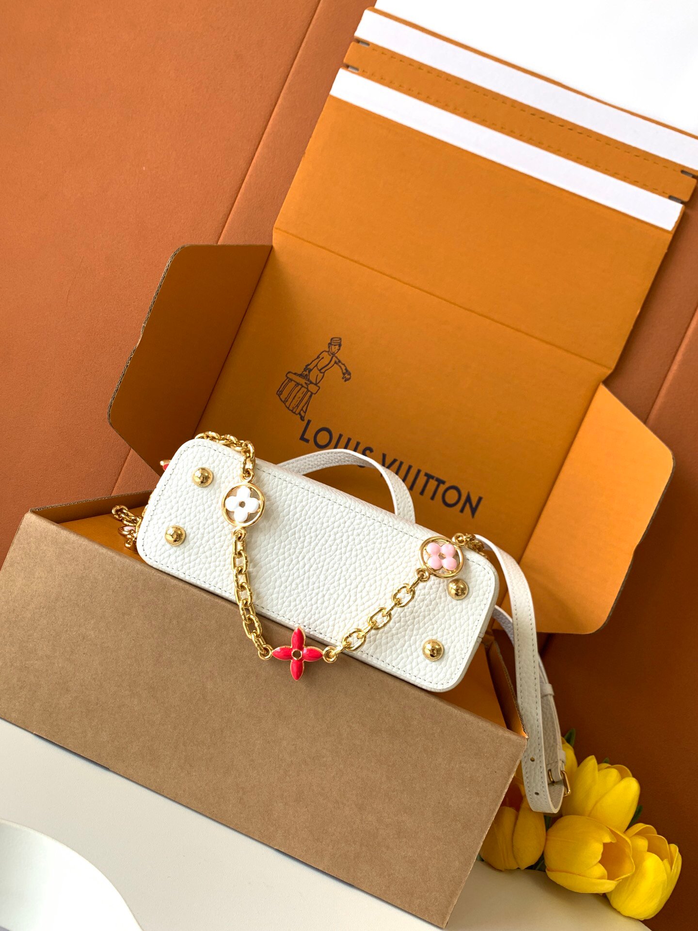 This Capucines mini handbag embodies soft beauty: the imported Taurillon leather body is equipped with a light-colored flap and top handle, and the enamel Monogram flower chain can also be worn on the shoulder. Wear the slim leather strap to explore more styling possibilities.
