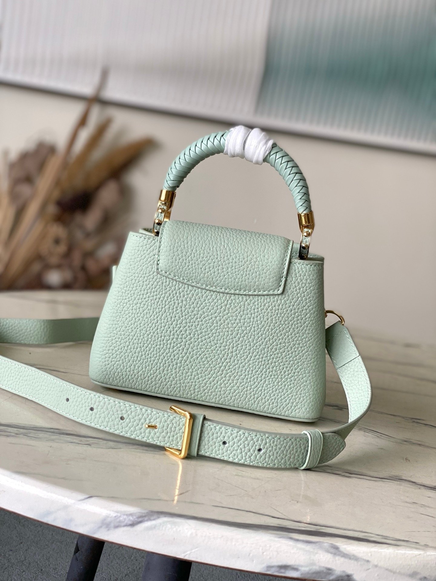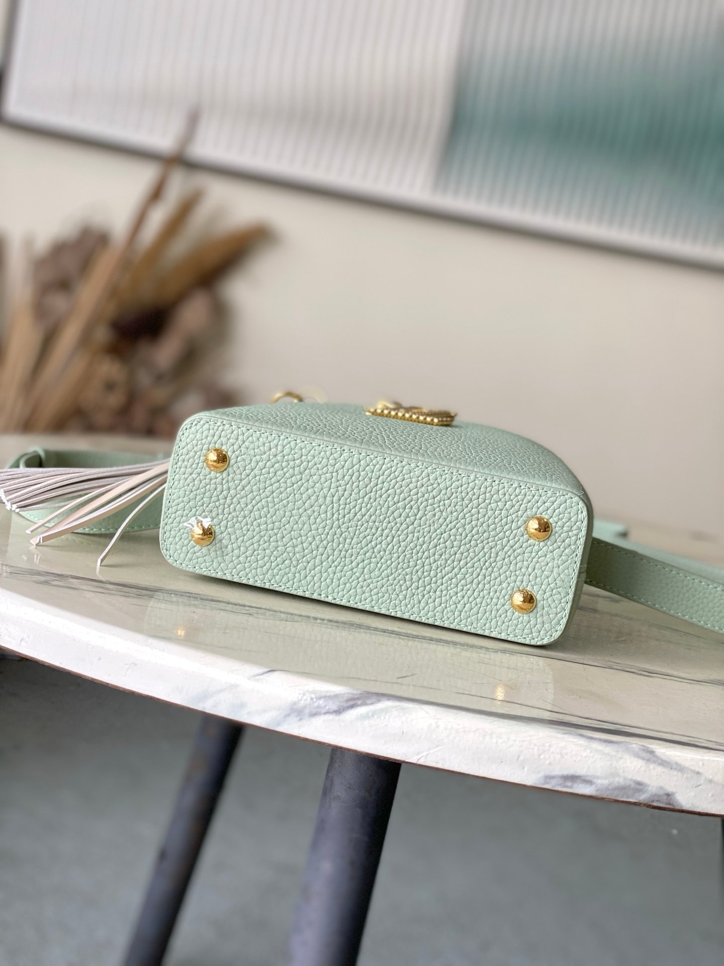 p1350 Premium original leather M15157 Avocado green mini Capucines series is named after the Paris street where Louis Vuitton opened its first store in 1854. The Capucines mini bag features woven leather handles, tassels and a padlock, signature elements of the Crafty collection. The LV letters present a embossed effect, subtly proving the brand’s exquisite craftsmanship. Dimensions: 13.6 × 8 × 21 cm
