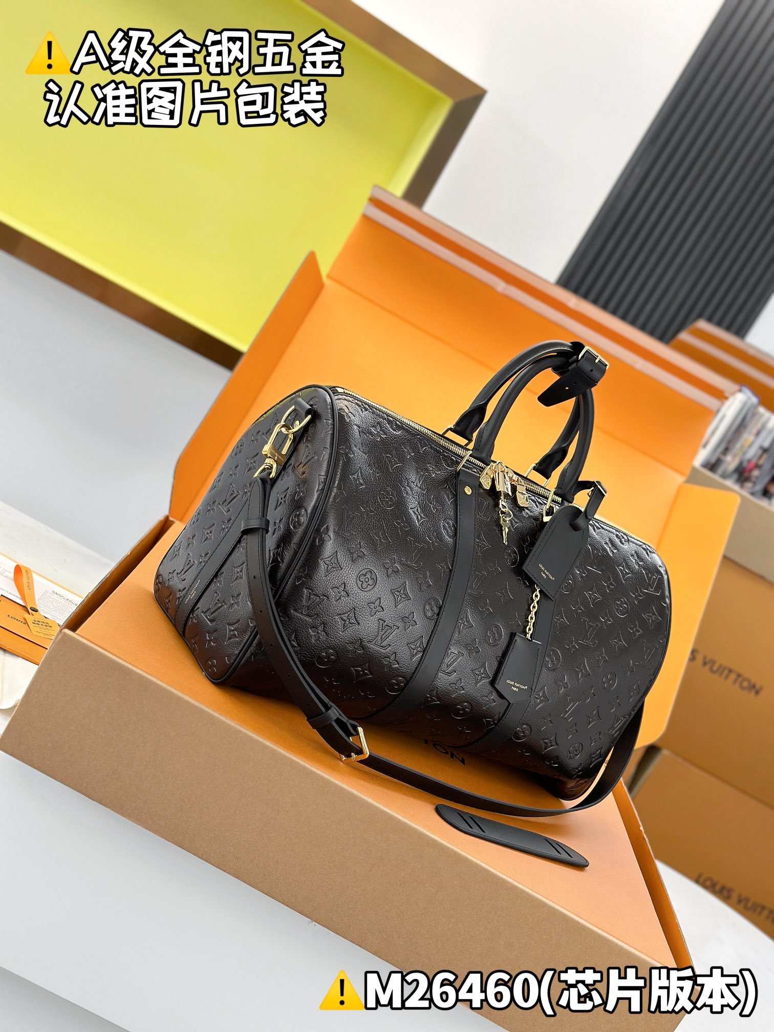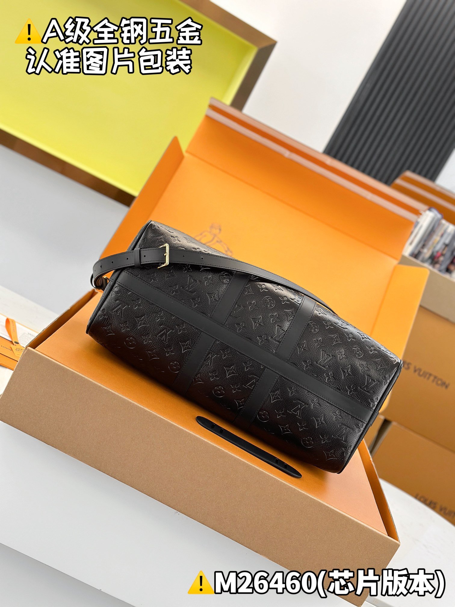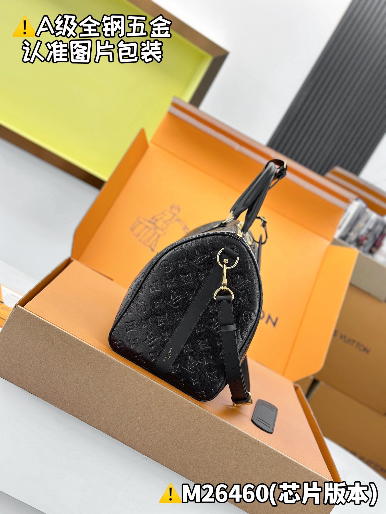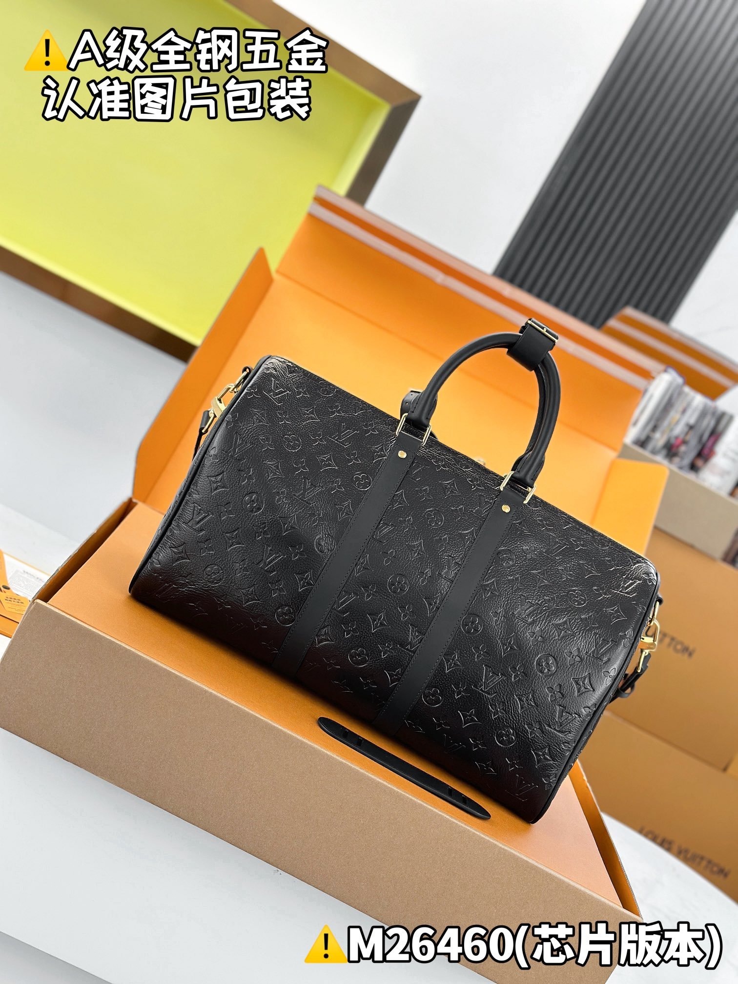 p1450 M26460 new style full leather (all steel hardware) [Chip version: with full set of packaging] KEEPALL 45 travel bag The Keepall Bandoulière 45 travel bag is crafted from Monogram embossed cowhide with glossy cowhide trim and dazzling hardware. The classic style pays homage to the distressed leather design of vintage Louis Vuitton trunks, while the fabric lining complements the rich tones of the leather. 27 x 20 x 45 cm (height x width x length)