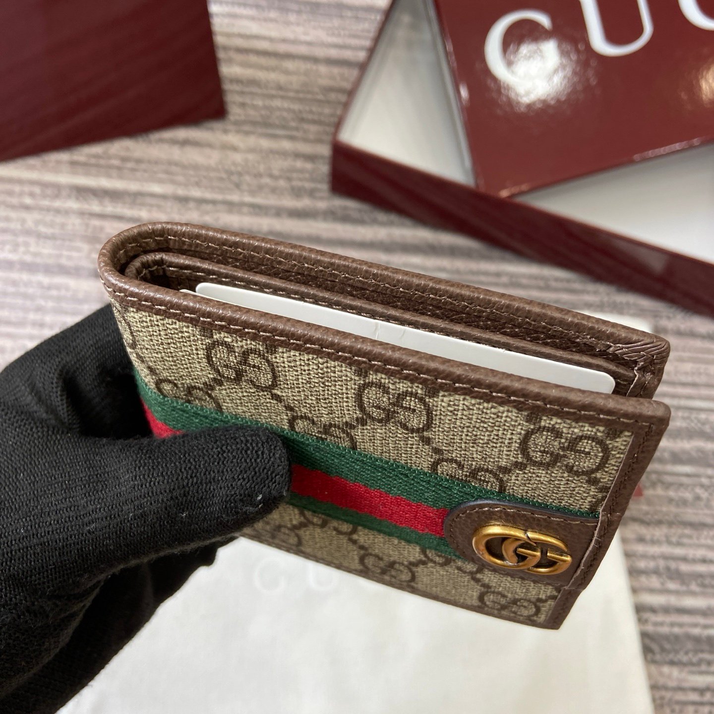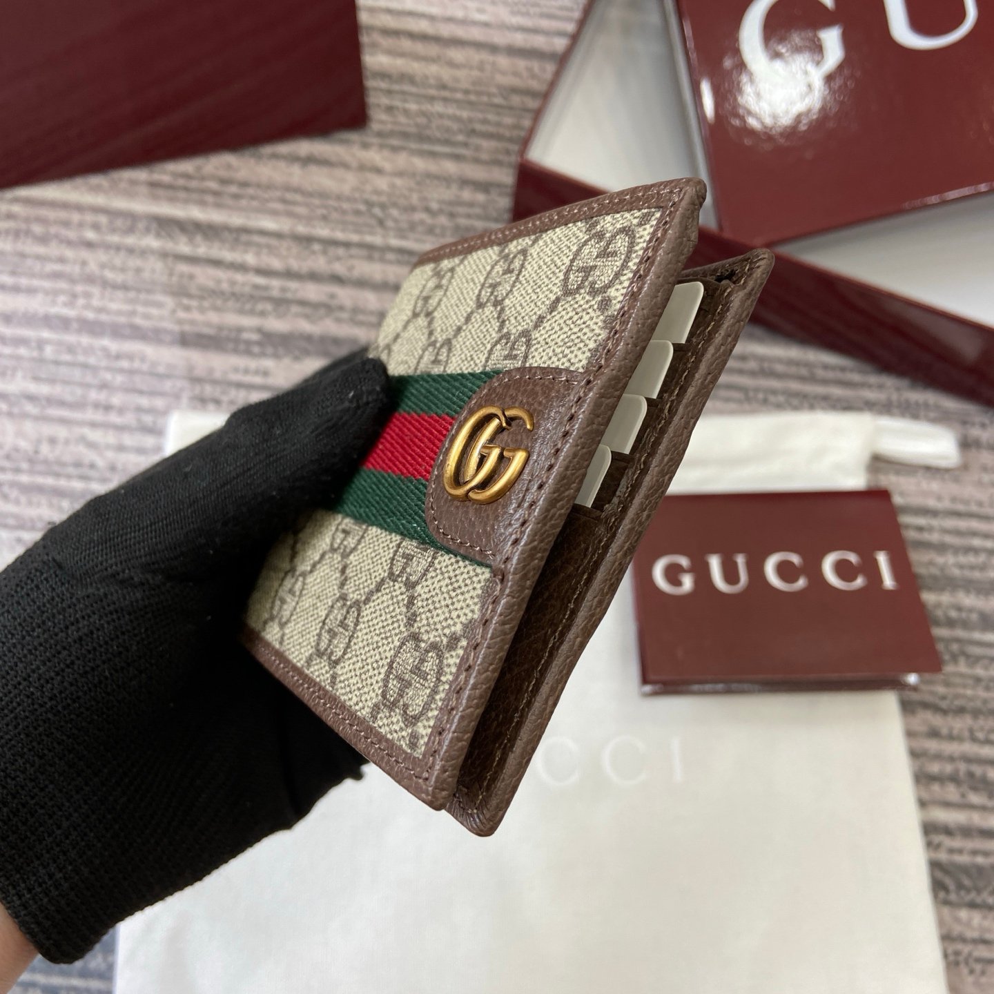 p170. [With complete packaging]‼ ️The Ophidia series combines two colors of beige and ancola red, with classic silhouettes and new functions, and is made of soft-touch fabrics. This bifold wallet is crafted from coated fabric with a GG monogram pattern and is expertly embellished with the Double G logo and web details.