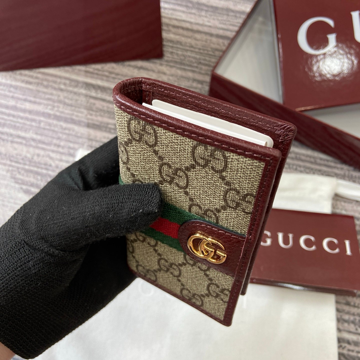 ![p170. [With complete packaging]‼ ️The Ophidia series combines two colors of beige and ancola red, with classic silhouettes and new functions, and is made of soft-touch fabrics. This bifold wallet is crafted from coated fabric with a GG monogram pattern and is expertly embellished with the Double G logo and web details.