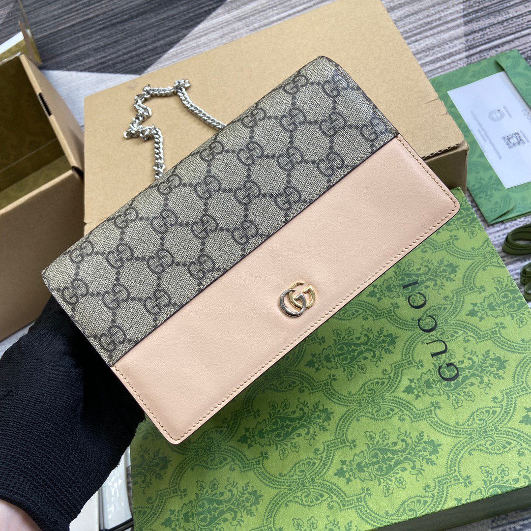 p350. (With complete packaging)‼ ️[New product] Marmont series chain wallet The brand’s representative patterns are transformed into symbolic elements that are versatile yet classic, adding color to the new series. This chain wallet is crafted from beige and ebony canvas and light beige leather, embellished with the signature two-tone logo. Beige and ebony canvas, light beige leather trim, light gold-tone hardware, moiré fabric lining, two-tone, Interior: six card compartments, one flat pocket, one zipped gusset pocket and one open compartment, mirror, chain strap, snap fly, Weight: approx. 0.42 kg. Model: 790060. Dimensions: 12.5 (length) x 20 (width) x 4cm (thickness) Color: light beige pvc.