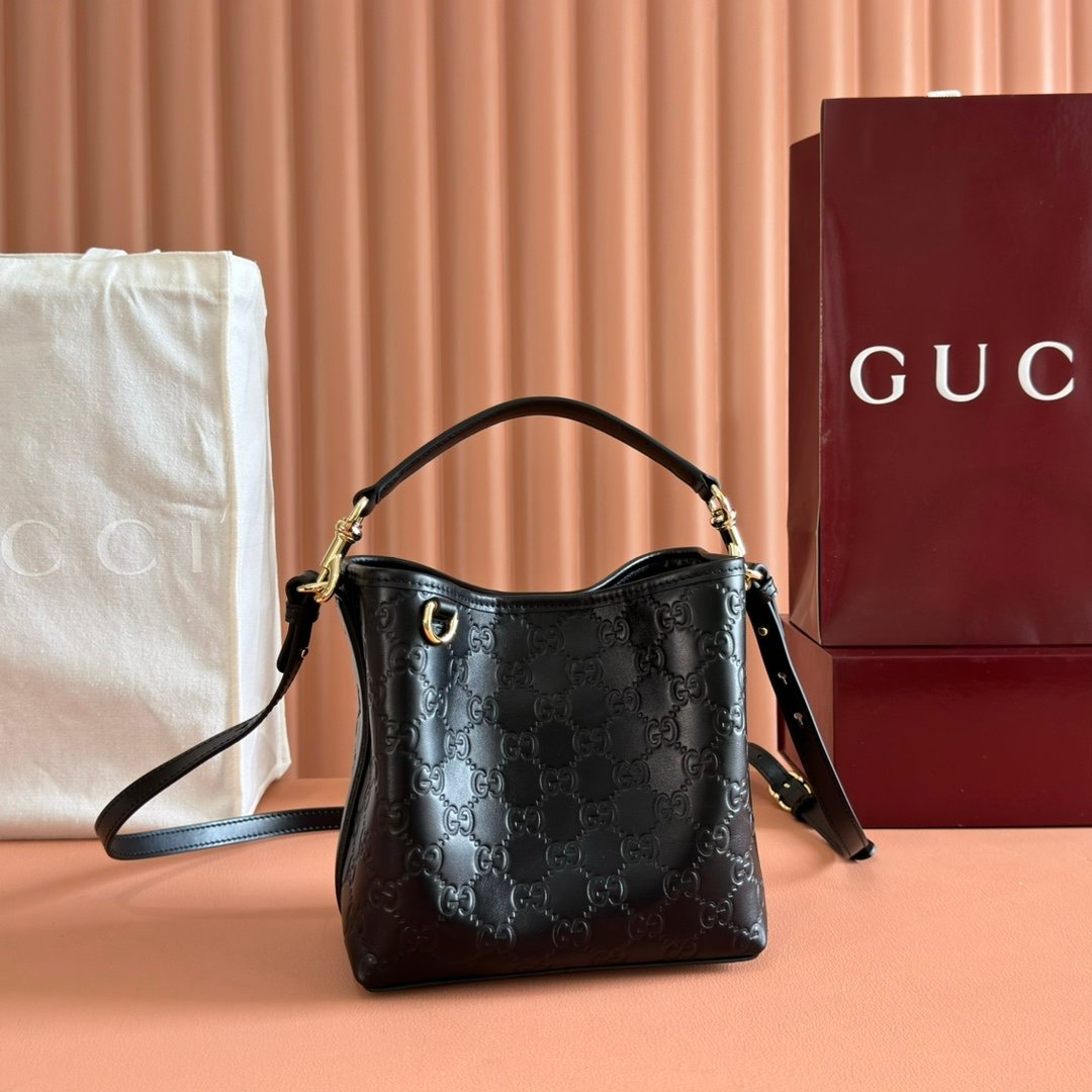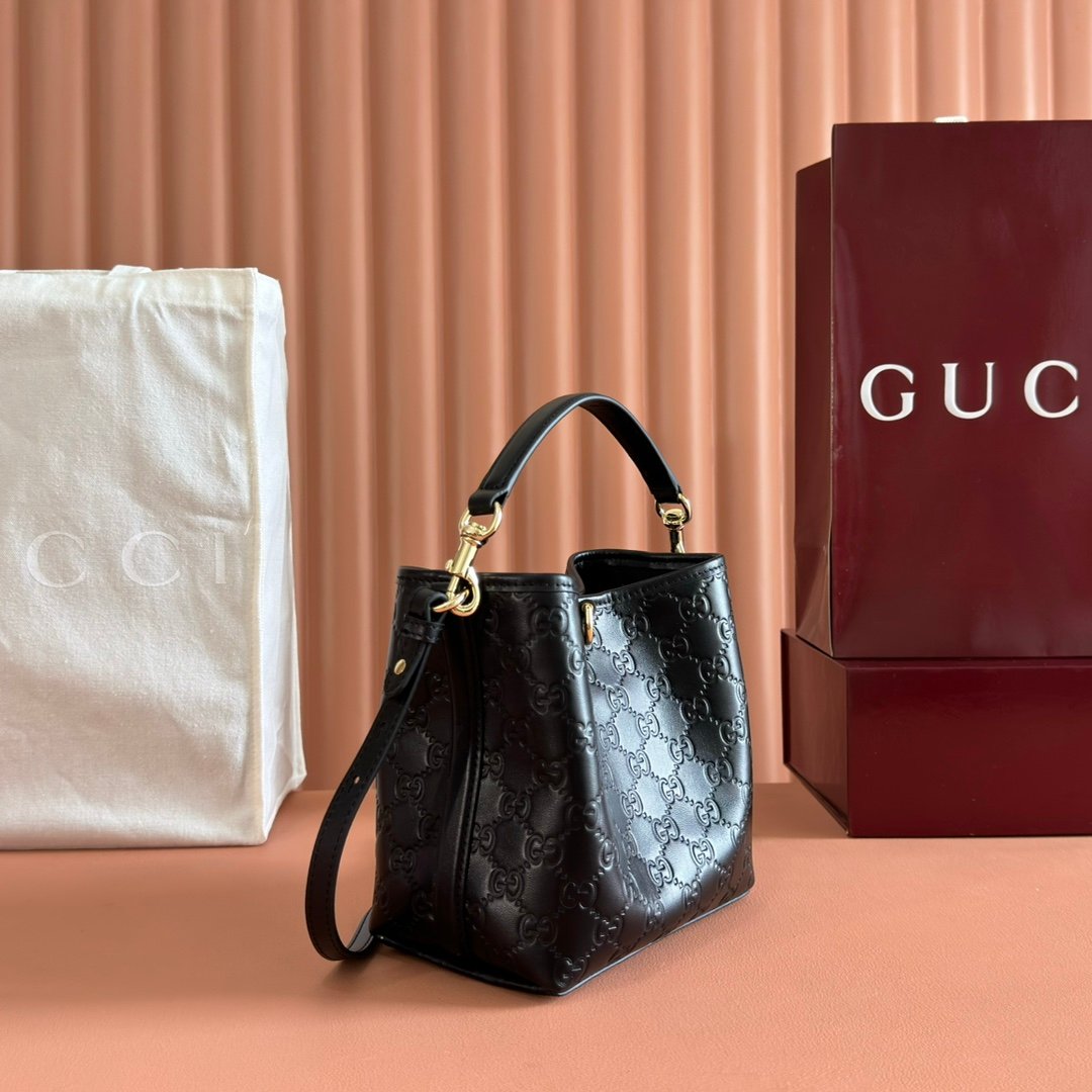 p570. 💋💋💋Original leather with complete packaging [New product] GG Emblem series reinterprets the brand’s timeless elegance and exquisite craftsmanship. Lined in webbed cotton, this bucket bag features an internal compartment for added functionality. Black GG printed embossed leather light gold tone accessories Black cotton and linen-blend lining Top handle with hook closure (height: 14 cm) Also comes with D-rings for hanging removable items Interior: two compartments and a central snap compartment Removable and adjustable leather shoulder strap (height: 52cm – 57.5cm; length: 107cm – 114cm) Magnetic snap closure Model: 815118. Dimensions: 19cm (width) x 18cm (height) x 11cm (depth) Weight: about 0.45kg Color: Black embossed original leather. Made in Italy
