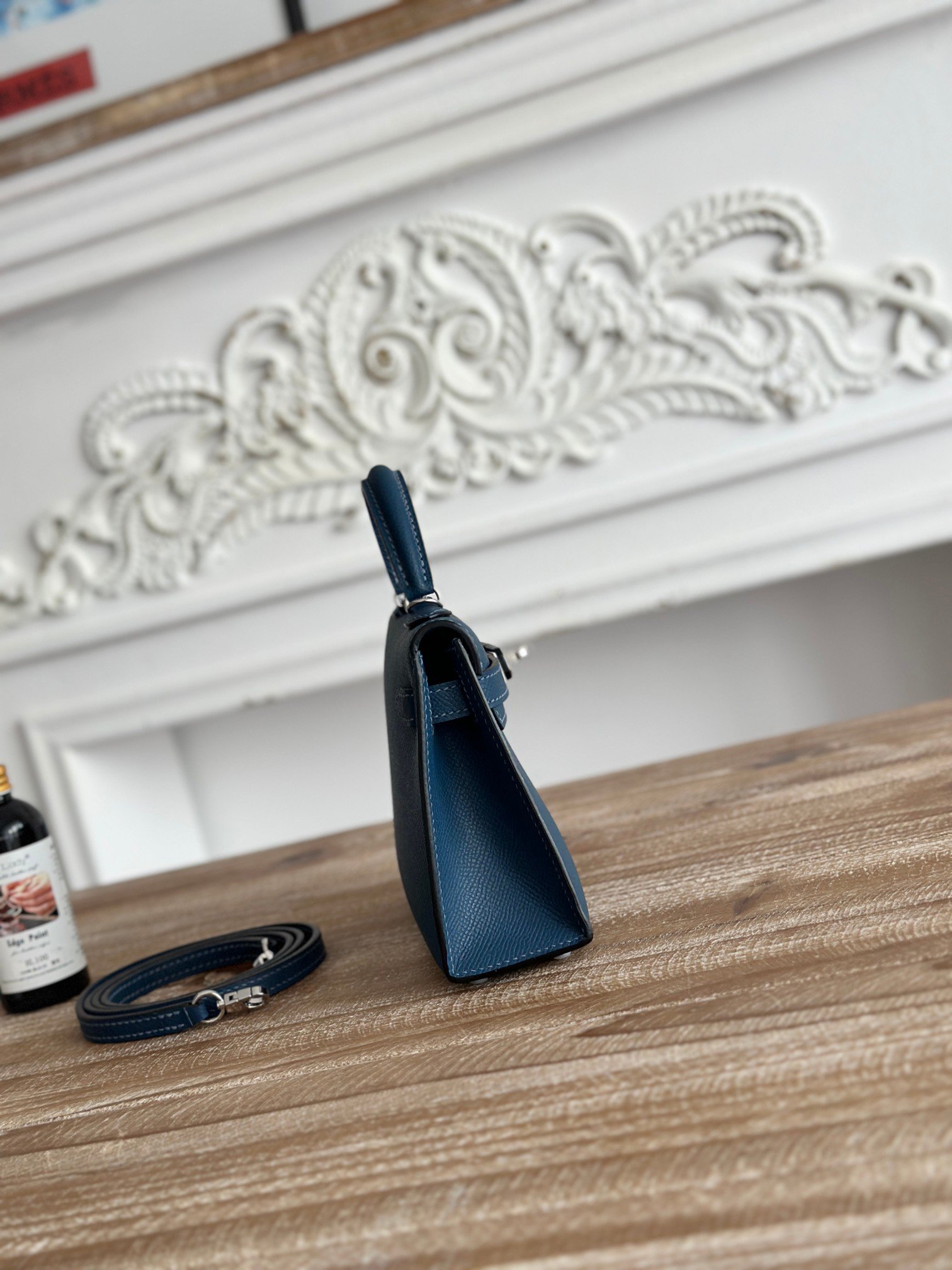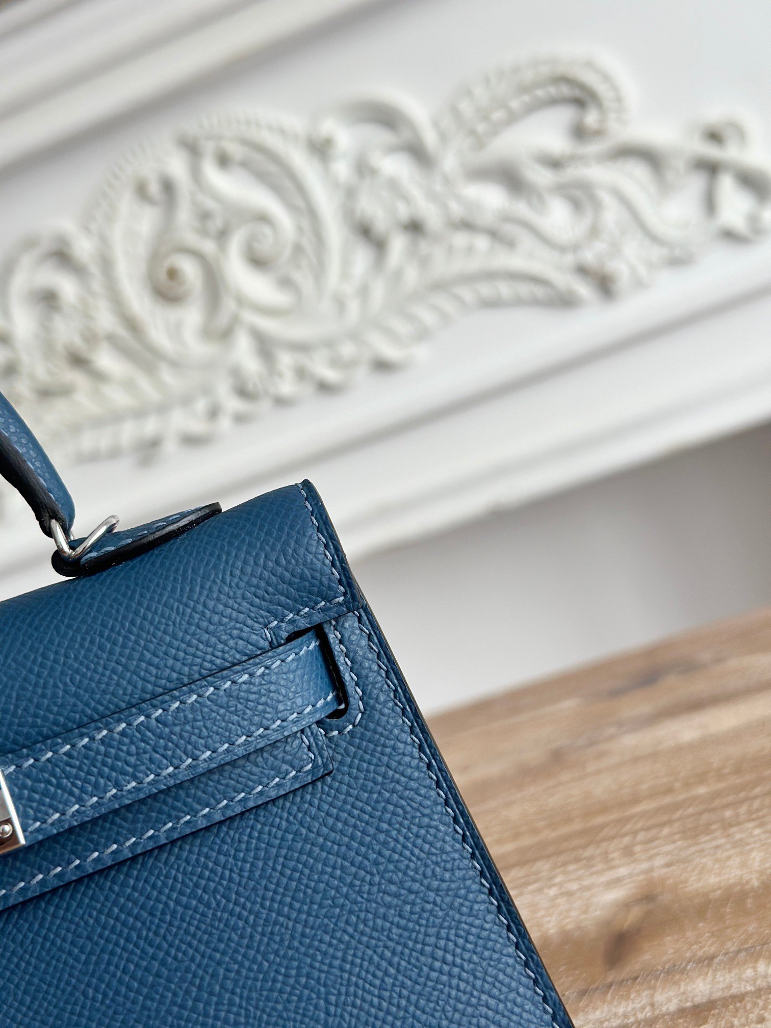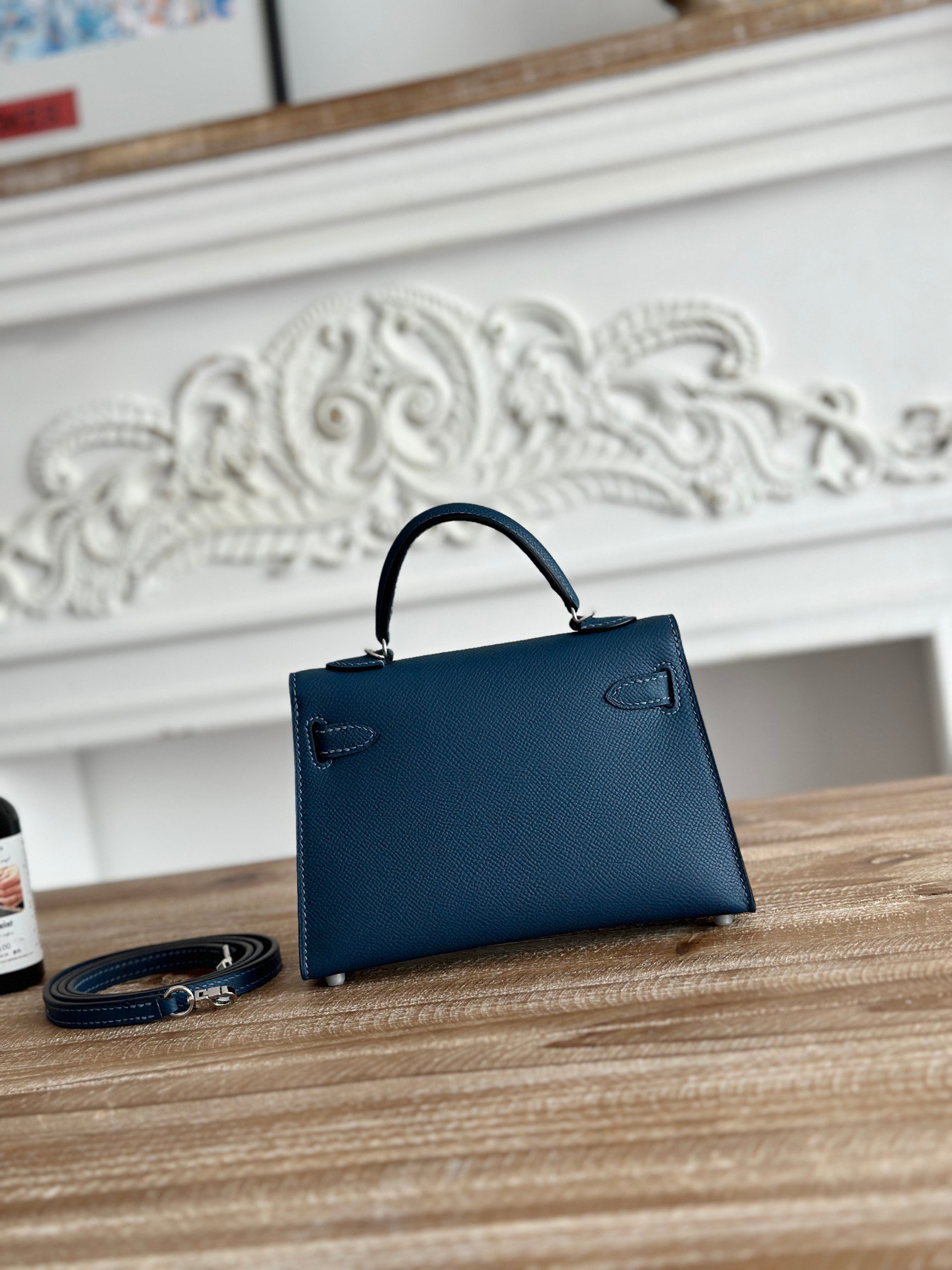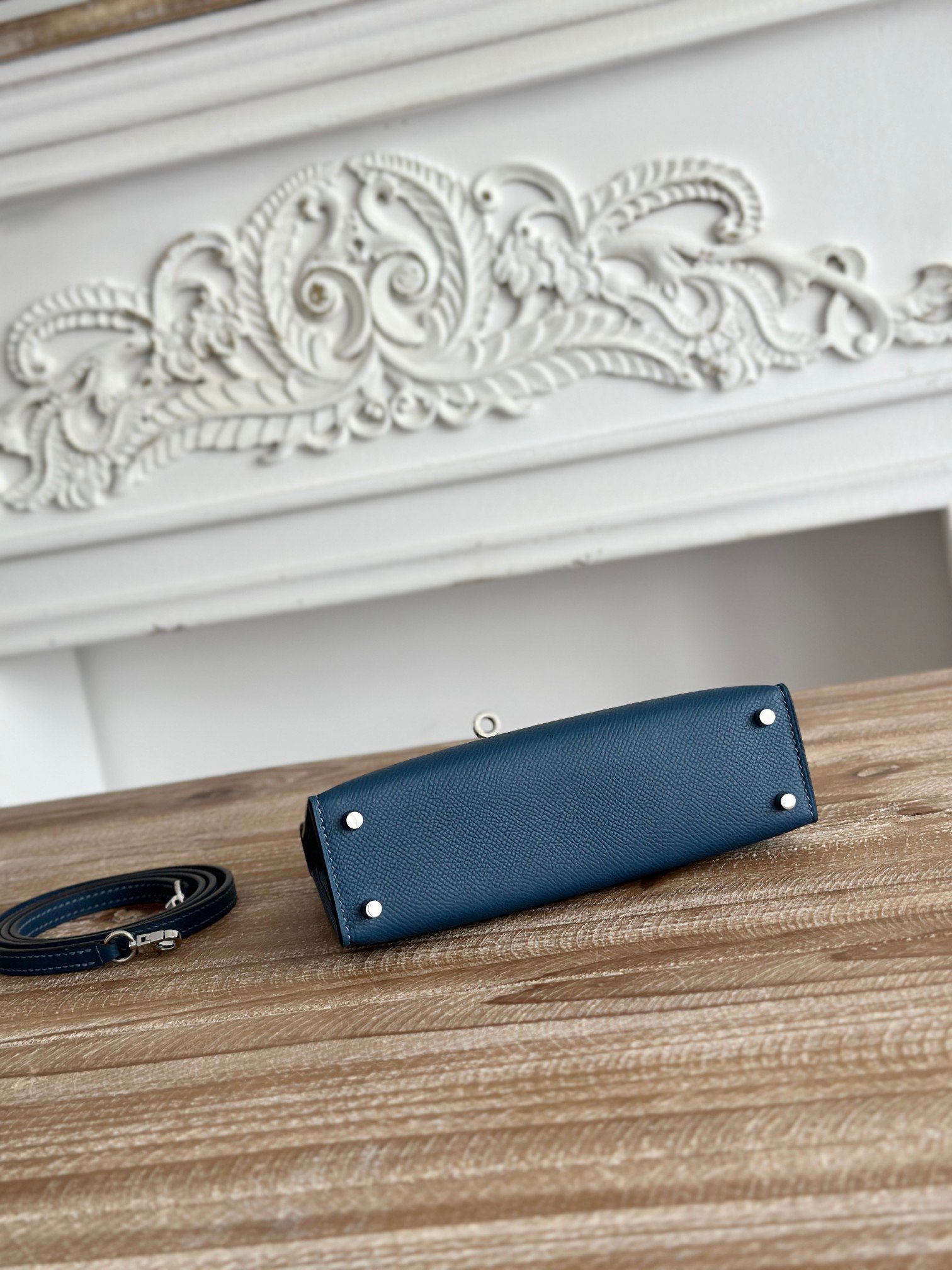 P600 exclusive background factory shooting, source of goods Kelly second generation mini Color: agate blue Imported epsom leather, Semi-handmade wax thread Size: 19cm