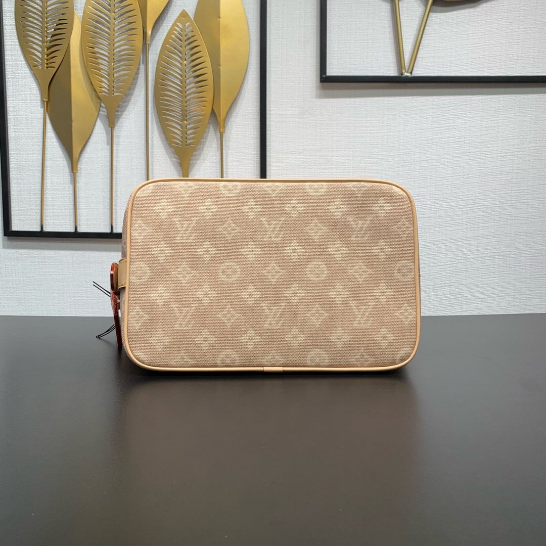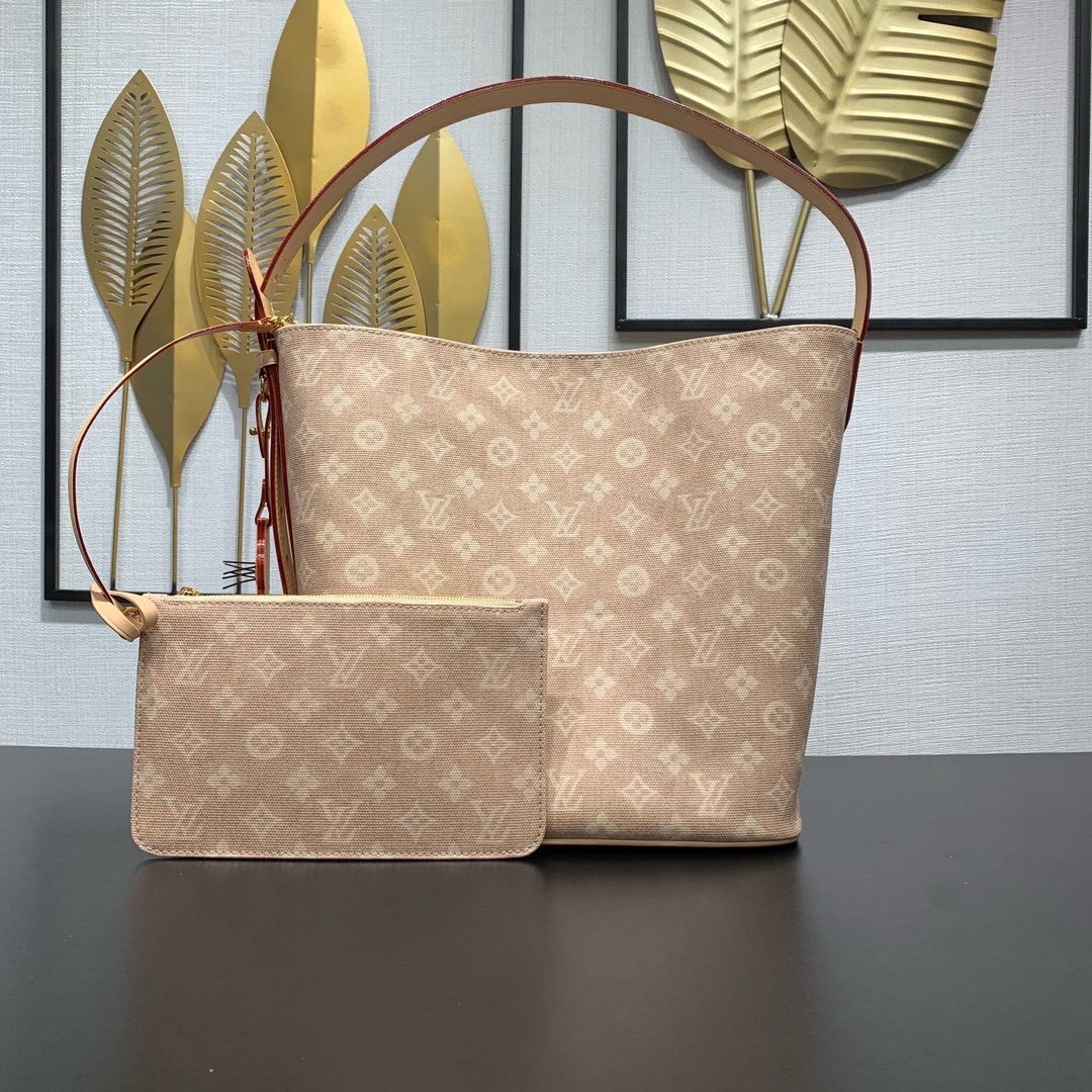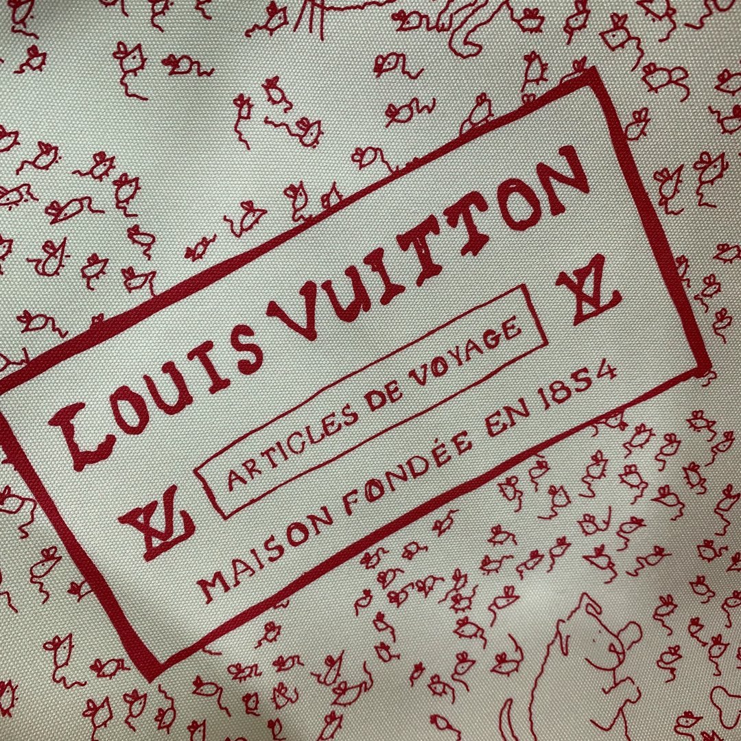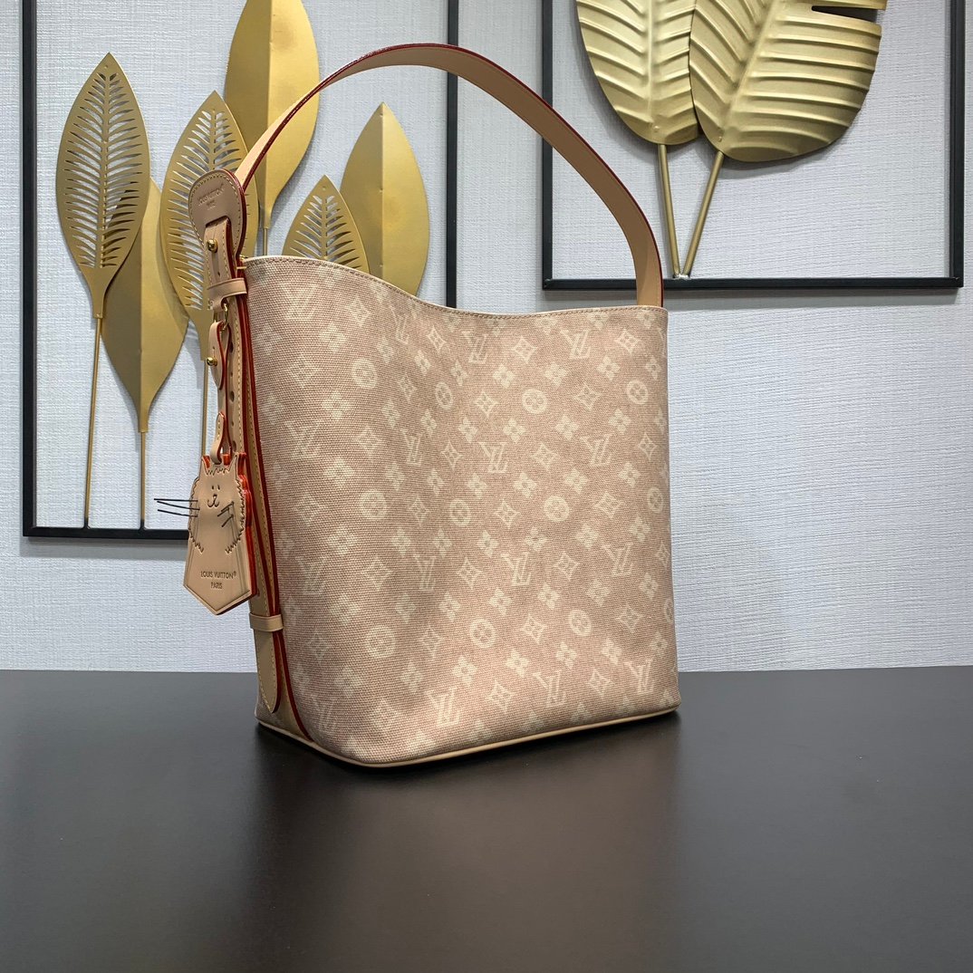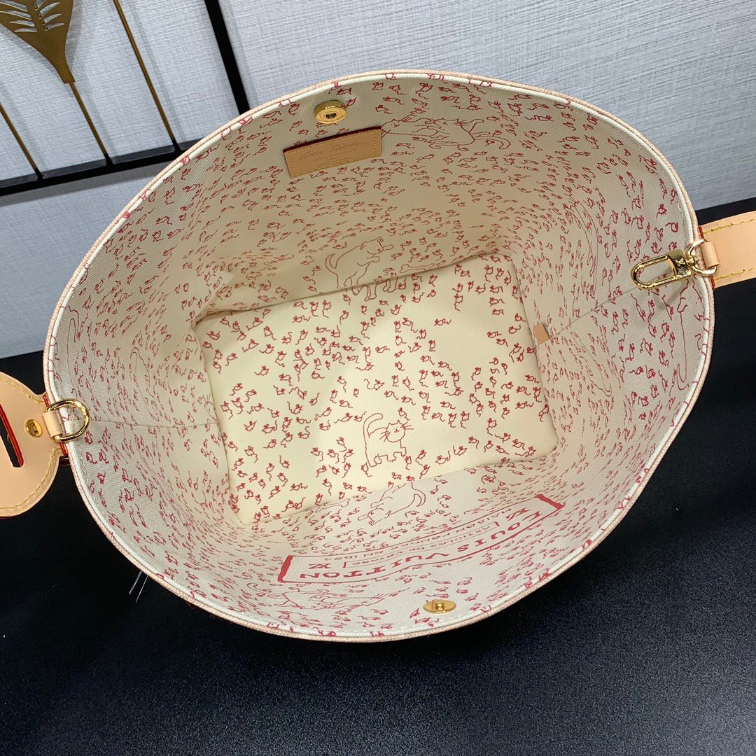 Part of the LV Travels With collection, this large All In bag reflects the design aesthetic of fashion icon and artist Grace Coddington in the Meowgram pattern. The canvas bag body is paired with cow leather trim and a fun cat-shaped key bag. The bucket shape can easily store daily necessities such as a laptop computer, and the detachable zipper bag adds functional considerations.